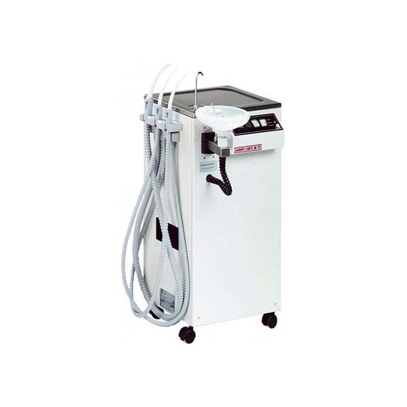 Sistema de aspiración insonorizado con ruedas. Ideal para quirófanos dentales. Dotado de un grupo hídrico completo y vaciado automático de los líquidos aspirados.