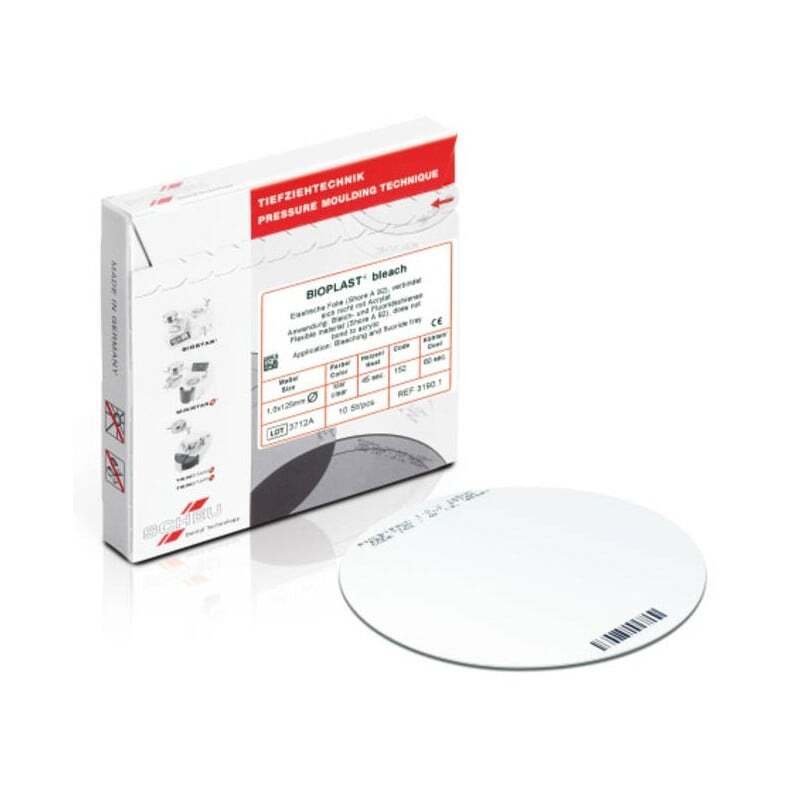 BIOPLAST® bleach es un material para termoformado de etilvinilacetato (EVA) blando y elástico, similar a la goma, que no se combina con resina autopolimerizable. No es necesario realizar un presecado del material antes del termoformado, ya que este no es higroscópico. BIOPLAST® ha sido probado y aprobado por su inocuidad biológica