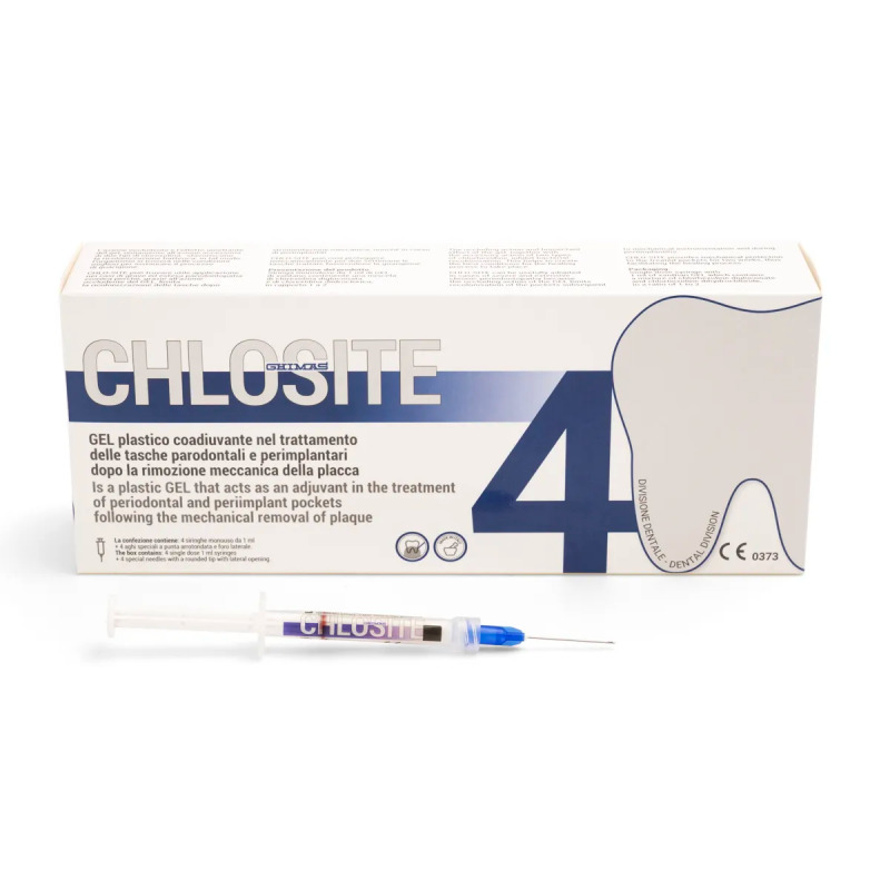 - La acción oclusiva del GEL limita la recolonización de la bolsa después del desbridamiento mecánico (SRP), o en caso de periimplantitis. CHLO-SITE puede proteger mecánicamente las bolsas tratadas durante dos semanas, favoreciendo el proceso de cicatrización.