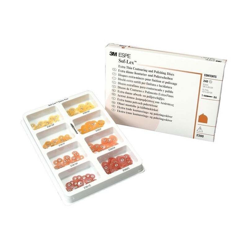SOF LEX KIT 240 Discos XT + Mandril 3M 2380 PULIDORESCARACTERÍSTICAS:- Sistema fácil de usar diseñado para crear restauraciones de alto brillo que ofrecen estéticas realistas. - Los discos están codificados por colores para permitir una fácil identificación de la secuencia de arenilla.- Tecnología de disco emergente diseñada para ahorrarle tiempo- Los discos extra delgados (XT) permiten un fácil acceso a las superficies interproximales al tiempo que ofrecen un disco ligeramente más rígido- Estos discos tienen un perfil extra delgado para un acabado y pulido precisos en áreas donde el acceso es un problema.- Acabado y pulido de restauraciones dentales de ionómero, cerámica y vidrio.