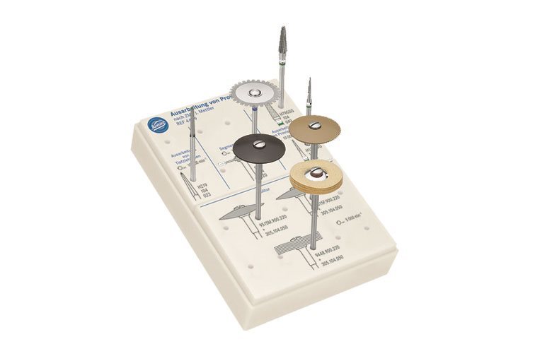 Contenido: H219 .104.023: Fresa cónica puntiaguda de carburo (13 mm), indicada para el trabajo sobre moldes acrílicos termoformados al vacío.946.104.220: Disco dentado de diamante revestido por ambas caras (3 mm), flexible y de 20 mm de diámetro.H79GSQ.104.040: Fresa cónica redondeada de carburo (13 mm) para el ajuste de acrílicos blandos.H136GSQ.104.016: Fresa cónica redondeada de carburo (8 mm) para el trabajo en acrílicos blandos.9515.900.220 – medio y fino: Pulidores para acrílicos, indicados para el pulido inicial y el acabado de alto brillo en prótesis acrílicas y provisionales.9448.900.220: Mopa de microfibra diseñada para obtener un pulido de alto brillo en metales preciosos y no preciosos, modelos colados, titanio, acrílicos y cerámicas.305.104.050: Mandril de acero inoxidable compatible con discos, pulidores y cepillos.