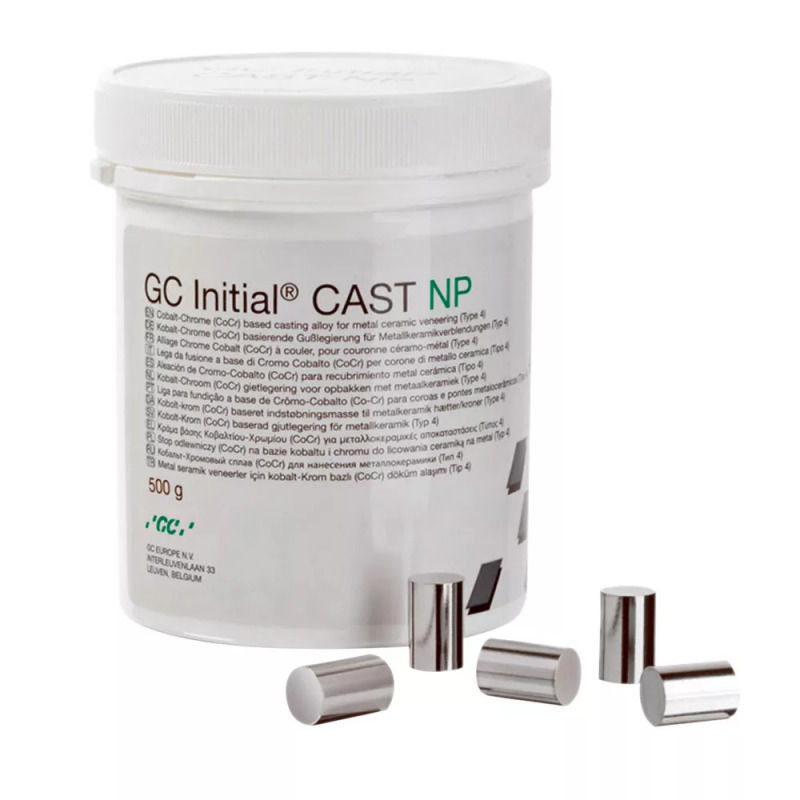 Initial CAST NP es una aleación de colado con base de cromo-cobalto para la fabricación de coronas y puentes con un revestimiento metálico de cerámica adecuado o material de revestimiento acrílico.