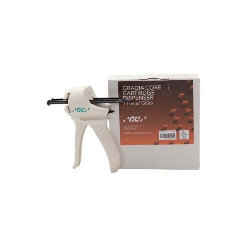 La Pistola 1:1 Gradia Core de GC es un dispensador profesional diseñado para aplicar de forma precisa los cartuchos de Gradia Core, un material de fotocurado dual para la reconstrucción de muñones y la cementación de postes. Permite un trabajo cómodo, limpio y controlado en restauración dental.