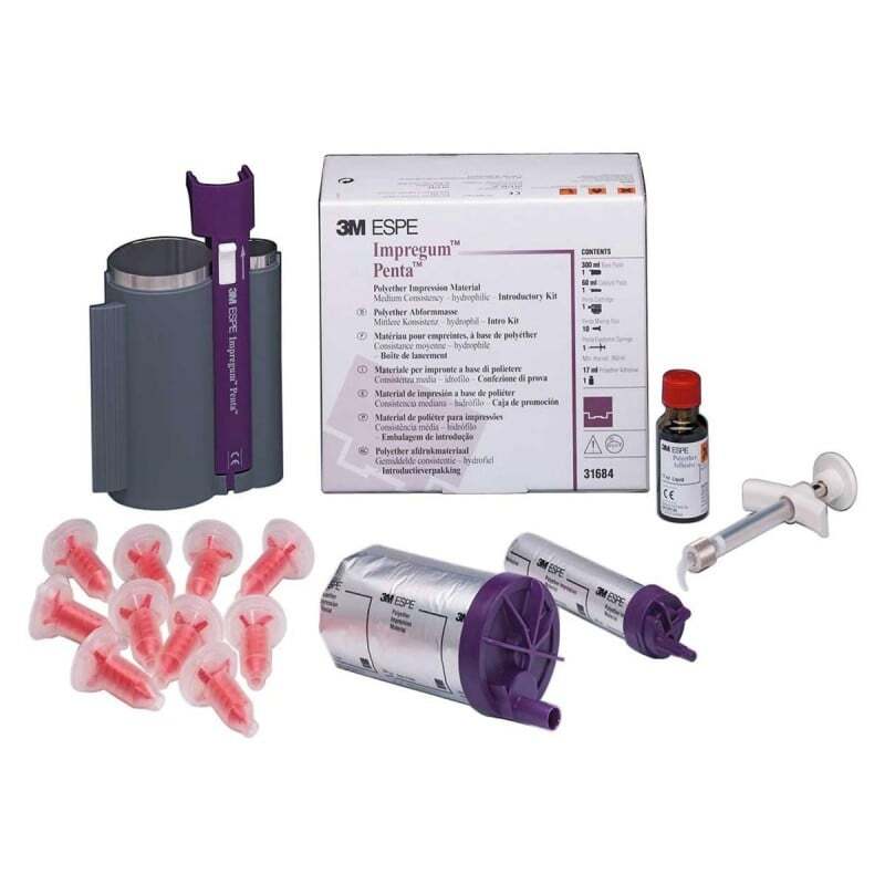 1 pasta base - 300 ml, 1 catalizador - 60 ml, 1 cartucho de Impregum™ Penta, 10 cánulas rojas Penta™, 1 jeringa para elastómero Penta™, 1 frasco de adhesivo para poliéter - 17 mlAPLICACIONES RECOMENDADAS - Impresiones de coronas y puentes- Impresiones de Inlay y onlay- Impresiones funcionales- Impresiones de implantes