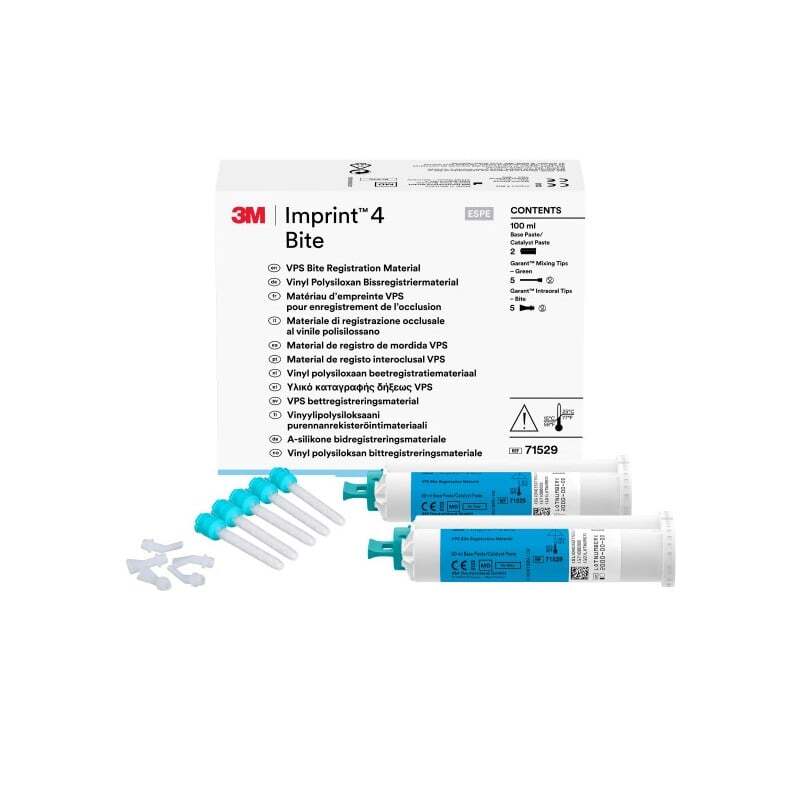 Gracias a sus excelentes propiedades de fluidez y una viscosidad lo suficientemente elevada, Imprint™ 4 Bite no fluye demasiado hacia las zonas interproximales y permite obtener registros de mordida de gran precisión. Su elevada dureza final y su reducida flexibilidad tras el fraguado facilitan el recortado, además de colocar con precisión los modelos de escayola. Imprint™ 4 Bite permite trabajar cómodamente y se fragua en solo 60 segundos, lo que permite que los procedimientos se realicen con rapidez mejorando el confort del paciente. Además, contribuye a reducir las imprecisiones provocadas por los movimientos de la mandíbula durante el fraguado.