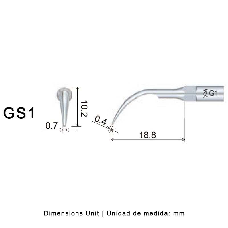 - Punta GS1. Universal profilaxis curva. Especial para eliminación de depósitos supragingivales en todos los cuadrantes. Compatible 3L