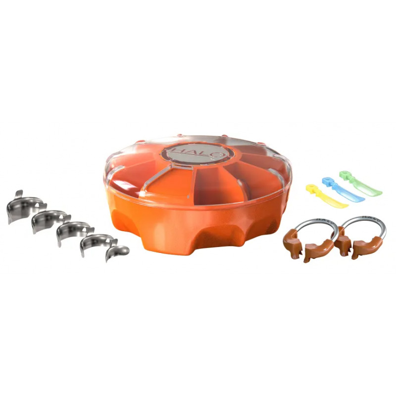 Contenido:  - 2 x Anillos Universales- 25 x Bandas matrices Originales 3.5 mm- 25 x Bandas matrices Originales 4.5 mm- 25 x Bandas matrices Originales 5.5 mm- 25 x Bandas matrices Originales 6.5 mm- 25 x Bandas matrices Originales 7.5 mm- 25 x Cuñas pequeñas (amarillas)- 25 x Cuñas medianas (azules)- 25 x Cuñas grandes (verdes)- 1 x Carrusel dispensador