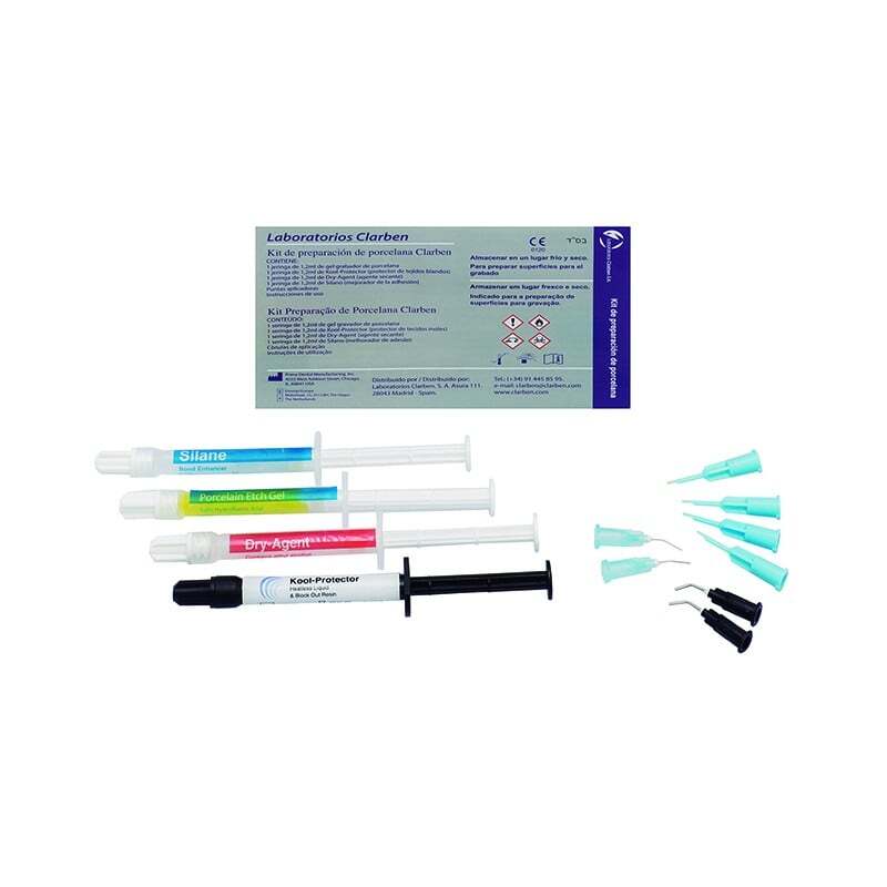 - GEL GRABADOR DE PORCELANA 1 jeringa x 1,2ml. 9,6% de Gel de Ácido fluorhídrico para grabar superficies de porcelana para adherir- SILANO 1 jeringa x 1,2ml. Incrementa la fuerza de la adhesión de los componentes y cementos de resina para porcelana- DRY RITE 1 jeringa x 1,2ml. Promueve el secado químico del grabado de superficies en porcelana antes de aplicar Silano- KOOL DAM 1 jeringa x 1,2ml. Protector de tejidos blandos que no se calienta y bloquea la entrada de la resina- 12 Puntas aplicadoras