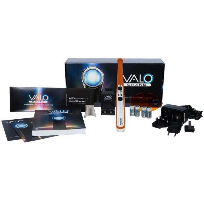 Contenido: - VALO Grand Cordless LED curing light Red Rock- 4 Baterías recargables- Cargador de batería- Fuente de alimentación de la unidad de carga- Blue light blocking light shield- Soporte para la pieza de mano- Pack de muestra de fundas protectoras