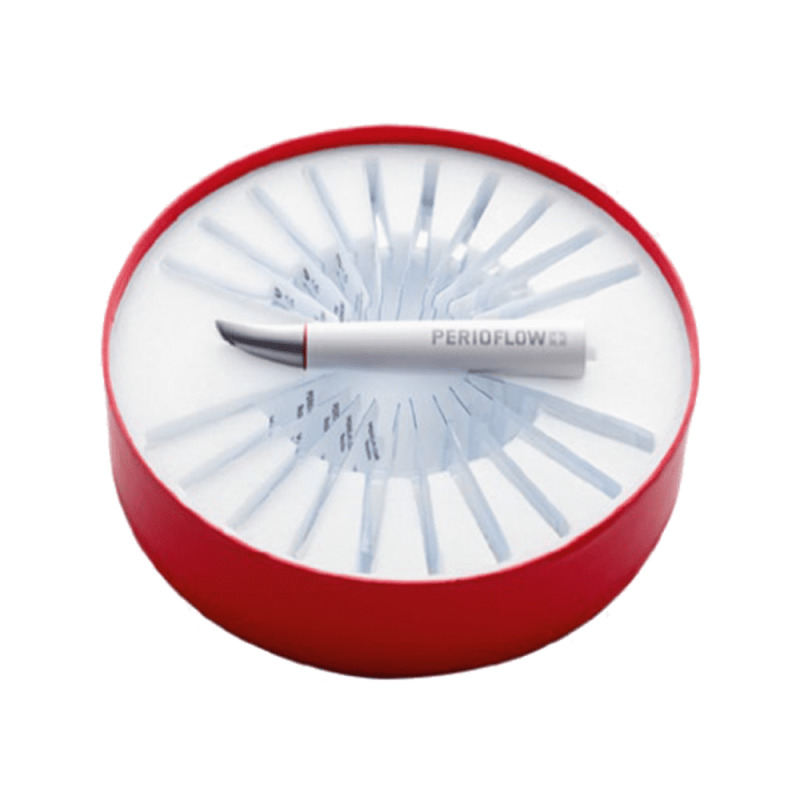 Contenido: - Mango PERIOFLOW®- 20 boquillas PERIOFLOW® idóneas para la eliminación del biofilm en bolsas periodontales y superficies de implantes. Profundidad recomendada > de 4 a 9 mm.