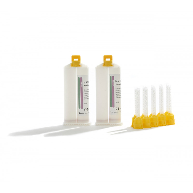 - La alta dureza Shore de 70 es ideal para transferir un encerado a una maqueta directamente en la boca. Su fácil manejo, buena fluidez y estabilidad garantizan una construcción de matriz sencilla y una polimerización rápida de materiales fotopolimerizables, y la alta transparencia de Matrix Flow 70 Clear garantiza una polimerización predecible de materiales fotopolimerizables.