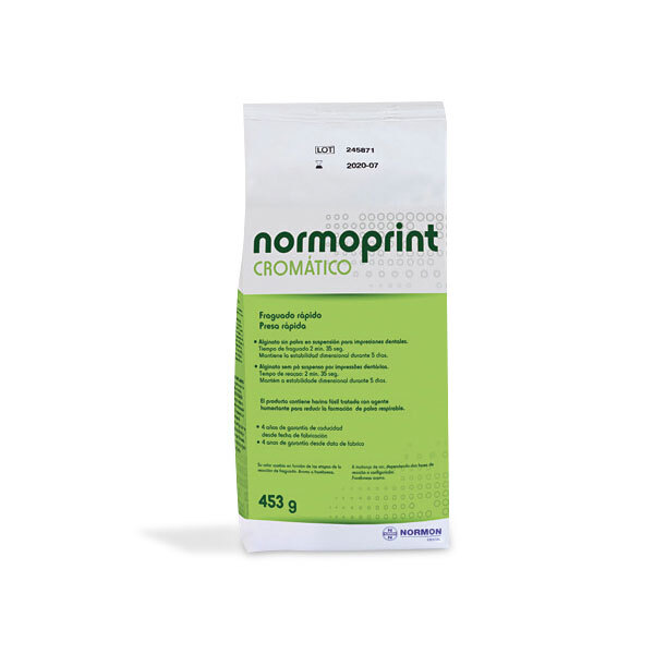 Normoprint Cromático es un alginato extrafino de fraguado rápido con tecnología de cambio de color, diseñado para facilitar la toma de impresiones dentales de alta precisión. Su transición cromática (verde → violeta → gris) indica las fases del proceso, ayudando al profesional a controlar el tiempo de trabajo y fraguado con mayor exactitud.
