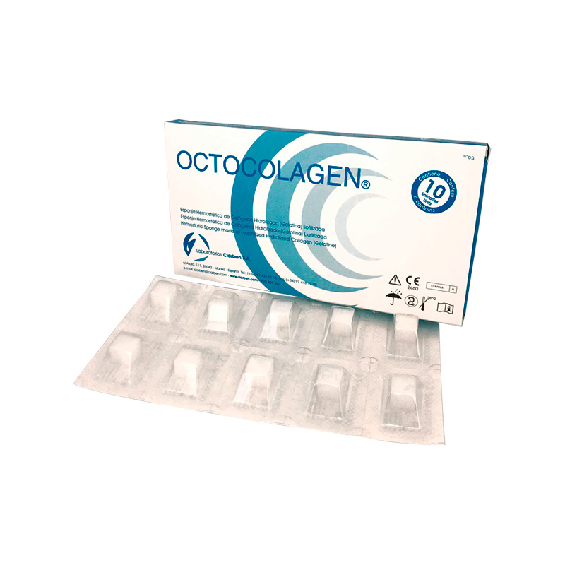 Octocolagen® es una esponja de gelatina liofilizada estéril cúbica que pesa menos de 10 mg que proporciona acción hemostática y curativa y es completamente reabsorbible por el cuerpo en 15 días. Se presenta para su uso y se envuelve individualmente en un blister.