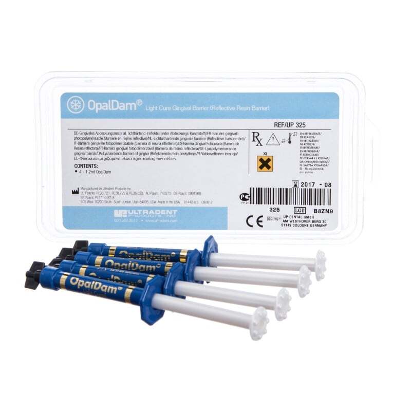 OpalDam es un material con base de metacrilato concebido para proteger el tejido que rodea a las piezas dentales que van a ser sometidas a un blanqueamiento. Además es fotopolimerizable y tiene la capacidad de reflejar la luz para mantener los tejidos aislados frente al calor. Es suficiente con fotopolimerizar apenas unos 10-20 segundos por diente. Después, secar la encía por completo antes de empezar con el procedimiento