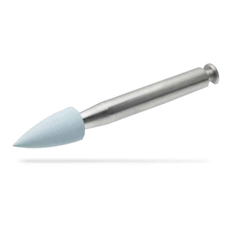 - Pulidor de diamante de alto brillo (paso 2) para el pulido de alto brillo de material cerámico y resina compuesta, disponible en las formas: llama, copa y lente (azul claro)