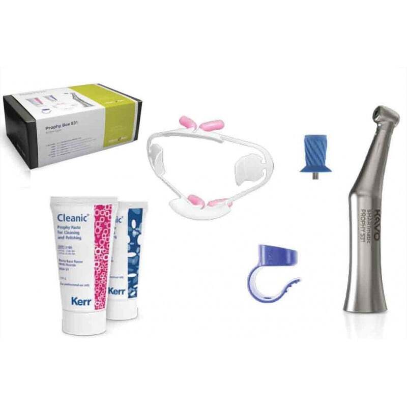 Contenido: - KaVo SMARTmatic PROPHY S31- 1 Cleanic en tubo, menta con fluoruro - 100 g- 1 Cleanic en tubo, frutos del bosque con fluoruro - 100 g- 1 Kit estándar OptiView (2 uds.)- 2 Prophy-Clips, esterilizables en autoclave, azules (6 uds. cada)- 1 Pro-Cup, tipo rosca, blanda (30 uds.)