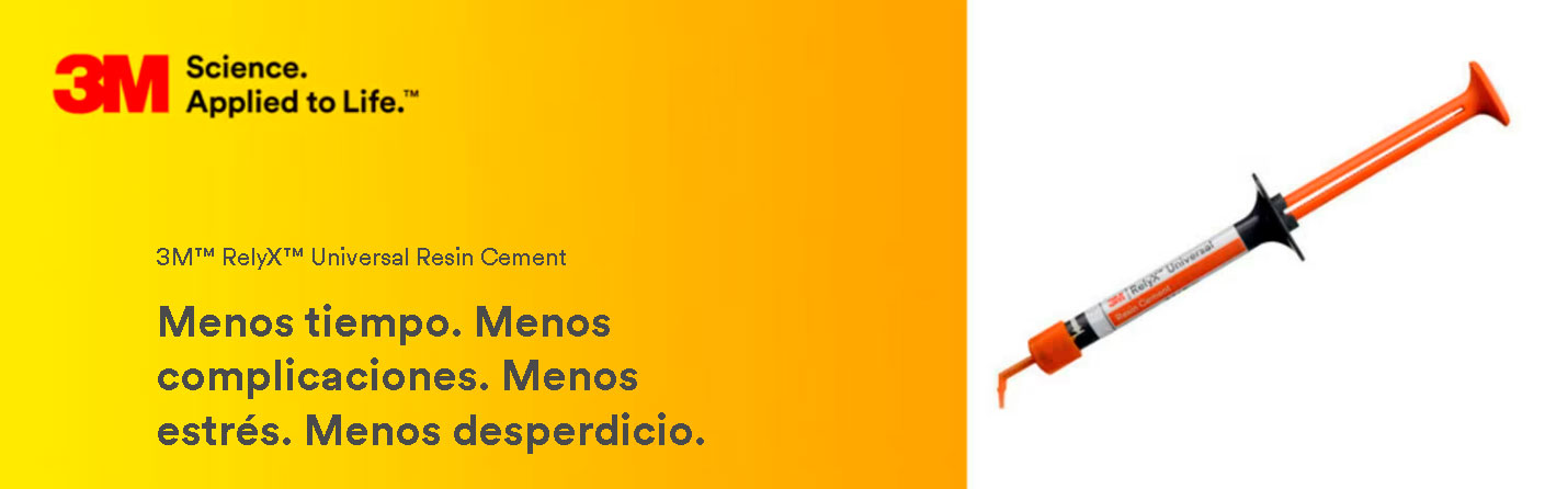 El cemento de resina 3M™ RelyX™ Universal te ofrece máxima versatilidad: puedes usarlo como cemento autoadhesivo o combinarlo con el adhesivo 3M™ Scotchbond™ Universal Plus para obtener un sistema adhesivo completo. Juntos, eliminan la necesidad de manejar varios cementos, primers y adhesivos, simplificando por completo tu flujo de trabajo en restauraciones indirectas. Con menos productos que almacenar y reponer, ahorras espacio, tiempo y dinero sin renunciar a la calidad ni al rendimiento.