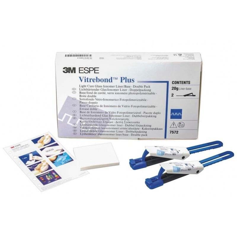 - Basta con hacer clic, mezclar y usar. Mínima microfiltración (comparado con la base caitaria Vitrebond™ original) reduce la sensibilidad posoperatoria