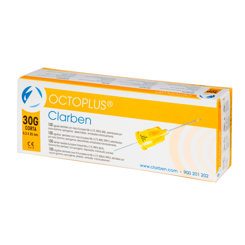 - Las agujas dentales Octoplus se suministran en un envase primario, destinado a protegerlas. El punto de soldadura que une el capuchón con el protector de la aguja garantiza el mantenimiento de la esterilidad de la aguja. El diámetro exterior de la aguja Octoplus es idéntico al de una aguja estándar, pero su diámetro interno ha sido preparado especialmente para inyectar la misma dosis de líquido anestésico con una presión menor. De ese modo, al conseguir el odontólogo controlar mejor su técnica y el flujo inyectado, el paciente disfruta de una inyección más suave.
