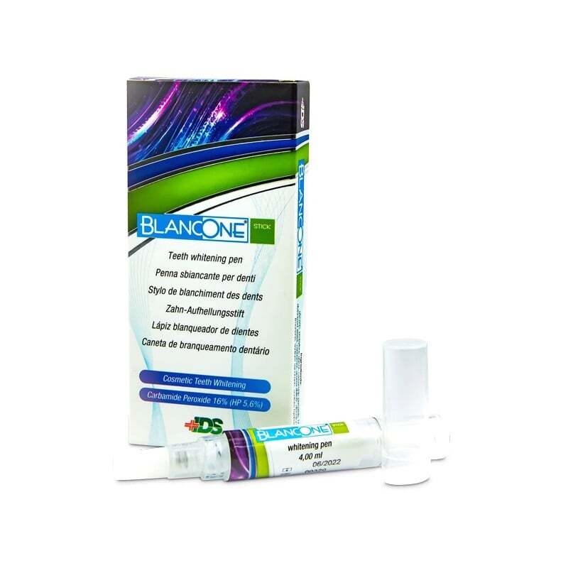 BLANCONE® STICK es un lápiz blanqueador con peróxido de carbamida al 16% que, activado por la acción de cepillado de la punta de silicona, libera oxígeno activo para eliminar manchas de nicotina, café, té, comidas y bebidas. Indicado para mantener por más tiempo los resultados de cualquier tratamiento de blanqueamiento profesional realizado por un dentista.