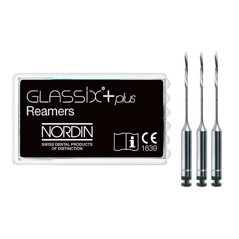 Postes Glassix de composite con fibra de vidrio y radiopacos. Constituidos por haces fuertes y elásticos de fibra de vidrio, trenzados y aglomerados con composite. La fibra de vidrio previene la fractura del poste, haciéndolo muy elástico y, contrariamente a los postes metálicos duros y rígidos, no trasmite tensiones y golpes a la dentina. Actúa junto a la dentina absorbiendo cualquier tensión pues presenta aproximadamente la misma elasticidad que ésta. El composite establece una unión con el cemento de resina y el composite utilizado para la reconstrucción del muñón. La característica especial de Glassix es su color de diente estéticamente agradable que hace que al poste integrarse en la restauración de composite sin transparentar. Los postes están disponibles en tres diámetros, en forma cilíndrica con una ligera conicidad en la punta, ideal para el conducto radicular y que coincide con los taladros calibrados. Los postes Glassix son largos y fáciles de cortar para ajustar a la longitud necesaria.