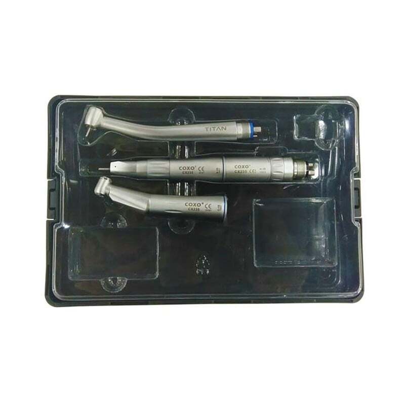 - 1 Turbina sin luz M4. Mod. TITANTurbina TITAN con rodamientos cerámicos y válvula anti retorno. Triple spray para una refrigeración óptima. Conexión directa a manguera con terminal midwest 4. Botón cambia fresa. Spray. Rotación 360º. Hasta 30.000 RPM. 12 watios de potencia (+/-).- 1 Micromotor neumático M4 spray interno- 1 Contraángulo 11 spray interno- 1 Pieza recta 11 spray interno
