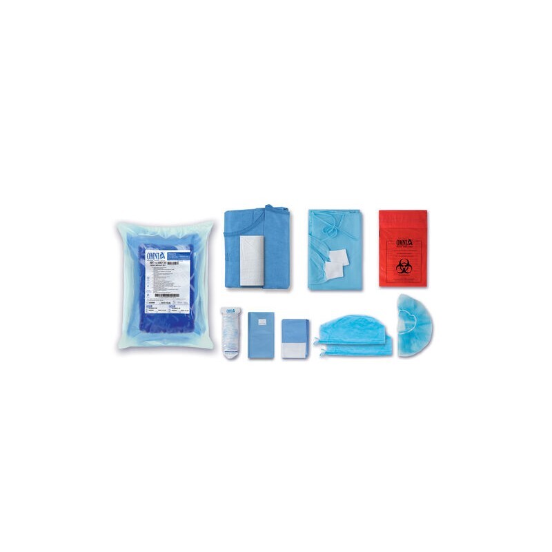 - 1 Bata modelo Special Plus de plegado quirúrgico (talla L) y 2 toallas de mano envueltas en papel médico SMS Microfibre Azul claro- 1 Bata con puños de algodón Tela no tejida (NWF) Azul claro- 2 Gorros quirúrgicos con cordones fijos Tela no tejida (NWF) absorbente Azul claro- 1 Gorro quirúrgico redondo para el paciente Tela no tejida (NWF) absorbente Azul claro- 1 Campo absorbente/impermeable de 50 x 75 cm con lado autoadhesivo* NWF+ Polietileno Azul claro- 1 Campo absorbente/impermeable de 75 x 90 cm con adhesivo* corte en forma de U de 11 x 9 cm NWF+ Polietileno Azul claro- 1 Funda Omnisleeve de 120 x 7 cm Polietileno Transparente- 1 Bolsa de desechos para material contaminado PVC Rojo