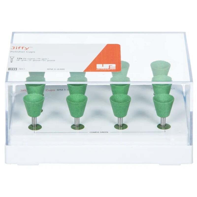 O sistema original de compósito Jiffy consiste em copos, pontas, discos e escovas de polir de alta qualidade. Os polidores contam com o nosso grão especialmente formulado que proporciona um belo acabamento em qualquer material composto e estão disponíveis em grãos grossos, médios e finos para dar forma rápida e completa a qualquer restauração composta. Os copos de polir possuem um design acanhado, flexível e de parede fina que é ideal para polir perto da gengiva. Os polidores Jiffy HiShineTM com grão ultrafino também estão disponíveis para proporcionar um acabamento extra suave e altamente polido.