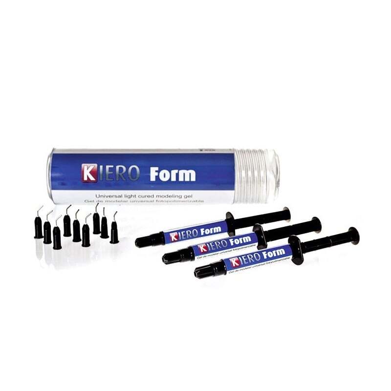 Kiero Form es un composite universal fotopolimerizable en forma de gel para la modelación de piezas para el fresado, ataches, así como para la fijación de trabajos a colar. Endurece en pocos segundos con cualquier máquina de luz entre 320 y 500 nm de potencia alta o baja. Se aplica fácilmente y directamente desde la jeringuilla. Una vez polimerizado es muy duro y se deja repasar bien.