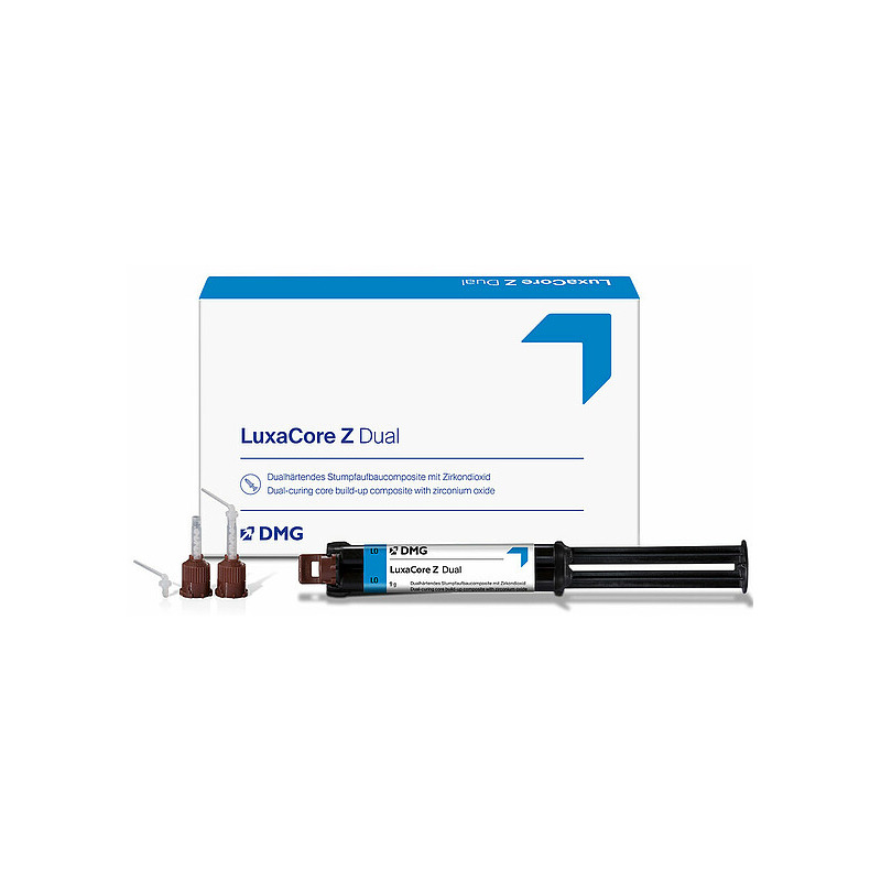 LuxaCore Z Dual es el material prémium de DMG para la reconstrucción de muñones y la cementación de postes radiculares. Ofrece una capacidad de recorte similar a la dentina, por tanto, permite remoción especialmente controlada de la substancia dental y una preparación precisa.