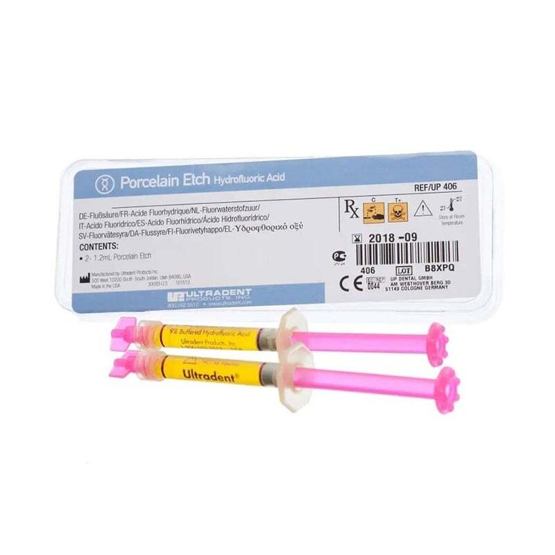 Ultradent 90-Porcelain Etch se usa para grabar carillas de porcelana, coronas, puentes, incrustaciones, recubrimientos y porcelana dental fracturada. El silano Ultradent de 60 segundos se usa después del grabado con ácido fluorhídrico para preparar la superficie para unir la resina.
