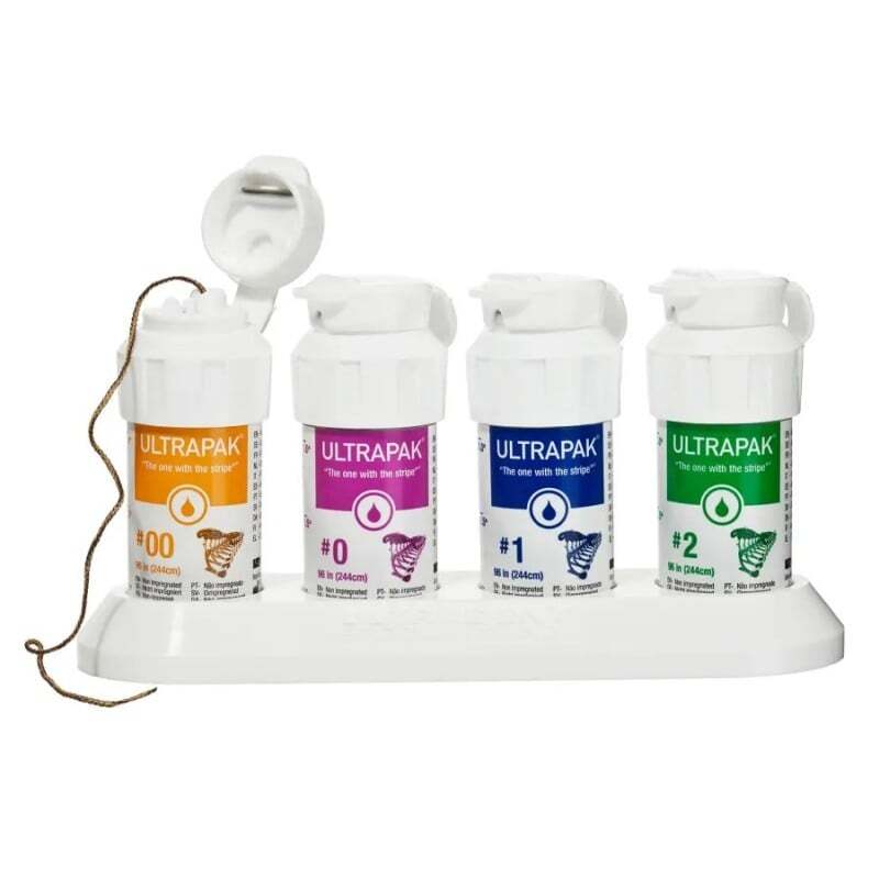 O fio Ultrapak é feito de 100% de algodão tecido em milhares de pequenos laços para formar longas cadeias entrelaçadas. Este design único de tecido exerce uma pressão suave e constante para fora após a colocação enquanto os laços tecidos tentam abrir-se. O deslocamento óptimo dos tecidos ocorre em 1 – 3 minutos.