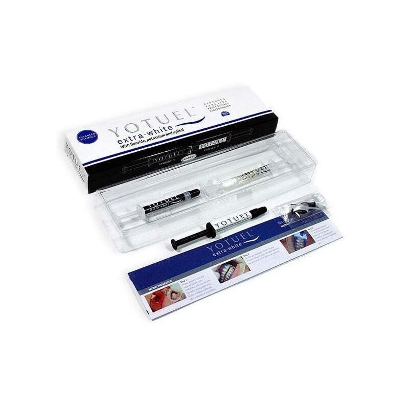 - 1 jeringa de YOTUEL extra – white professional concentration (0,5 ml)- 1 jeringa de YOTUEL extra – white activador (0,5 ml)- 1 jeringa de protector gingival (1 ml)