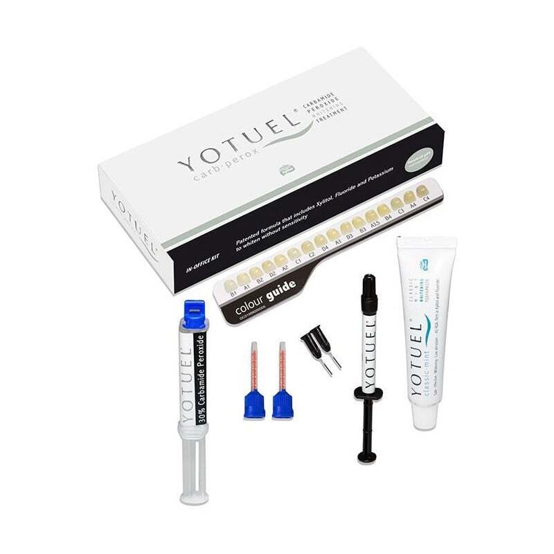 Conteúdo: - 1 jeringa dual (2,5 ml)- 1 jeringa de protector gingival (1 ml)- 1 YOTUEL dentífrico.